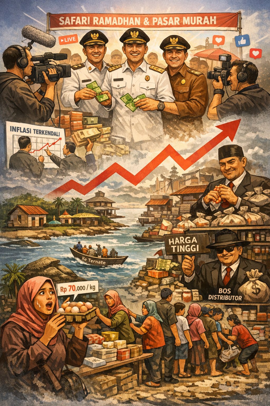 Dalam situasi inilah APBD memainkan peran yang ironis. Alih-alih digunakan untuk memperbaiki sistem distribusi, memperkuat logistik kepulauan, atau melindungi daya beli secara struktural, APBD justru dipecah menjadi program-program simbolik Ramadhan. Pasar murah digelar satu hari di pusat kota. Bantuan dibagi secara selektif. Safari Ramadhan dilakukan dengan pengawalan tim dokumentasi khusus, bahkan dengan kontrak APBD demi memastikan citra kepala daerah tersebar luas di media sosial.