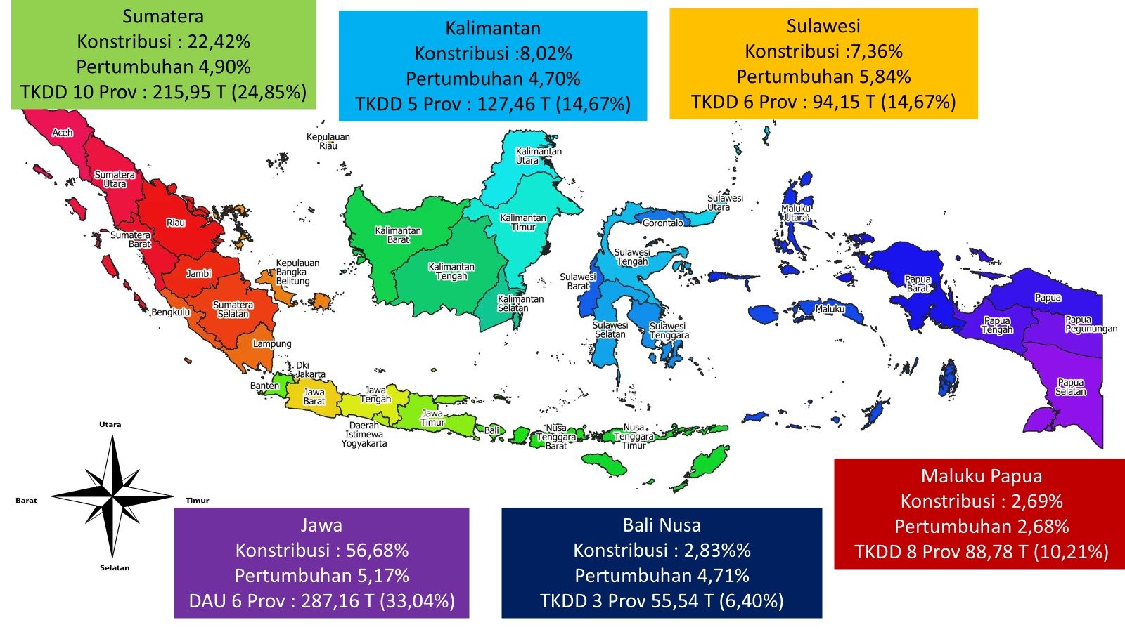 Pulau Jawa menjadi pemain utama yang menguasai 56,68% dari total pangsa pasar ekonomi nasional, disaat yang sama alokasi Transfer ke Daerah mencapai 33,04% atau Rp. 287,16 Triliun dari pagu nasional yang tersebar pada 6 Provinsi, sedangkan Papua dan Maluku, terdapat 8 Provinsi hanya mendapatkan alokasi 88,78% atau 10,21% dari total pagu nasional, disaat yang sama alokasi belanja pemerintah pusat yang tercermin dalam APBN masih tetap didominasi Pulau Jawa dan Sumatera, sehingga sulit bagi daerah-daerah lain untuk dapat mencapai kemajuan mendekati pulau Jawa apalagi setara pulau jawa suatu kemustahilan yang tak mungkin terjadi.